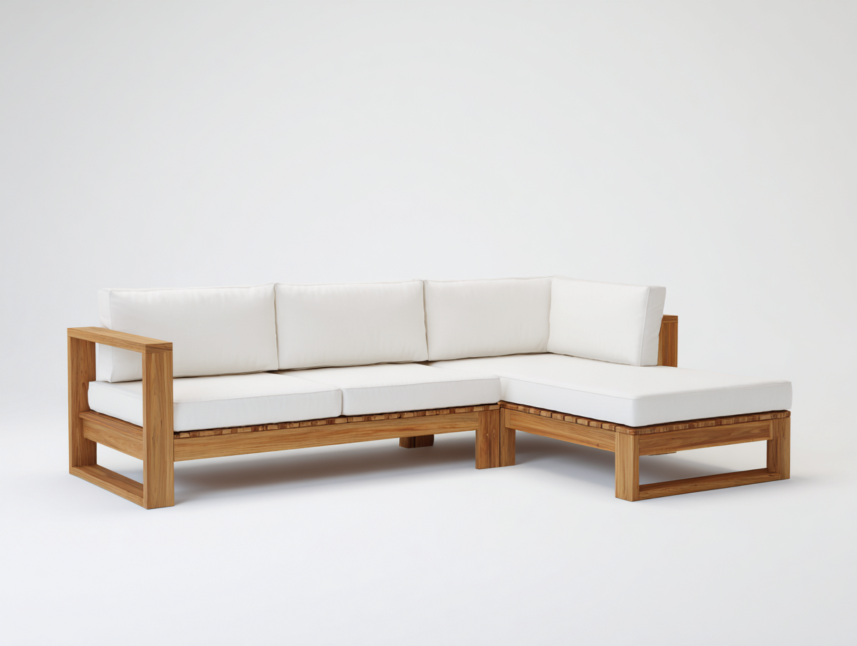 Sofás de exterior de madera 220x150x75 cm marrón claro cojines blancos diseño moderno para jardín