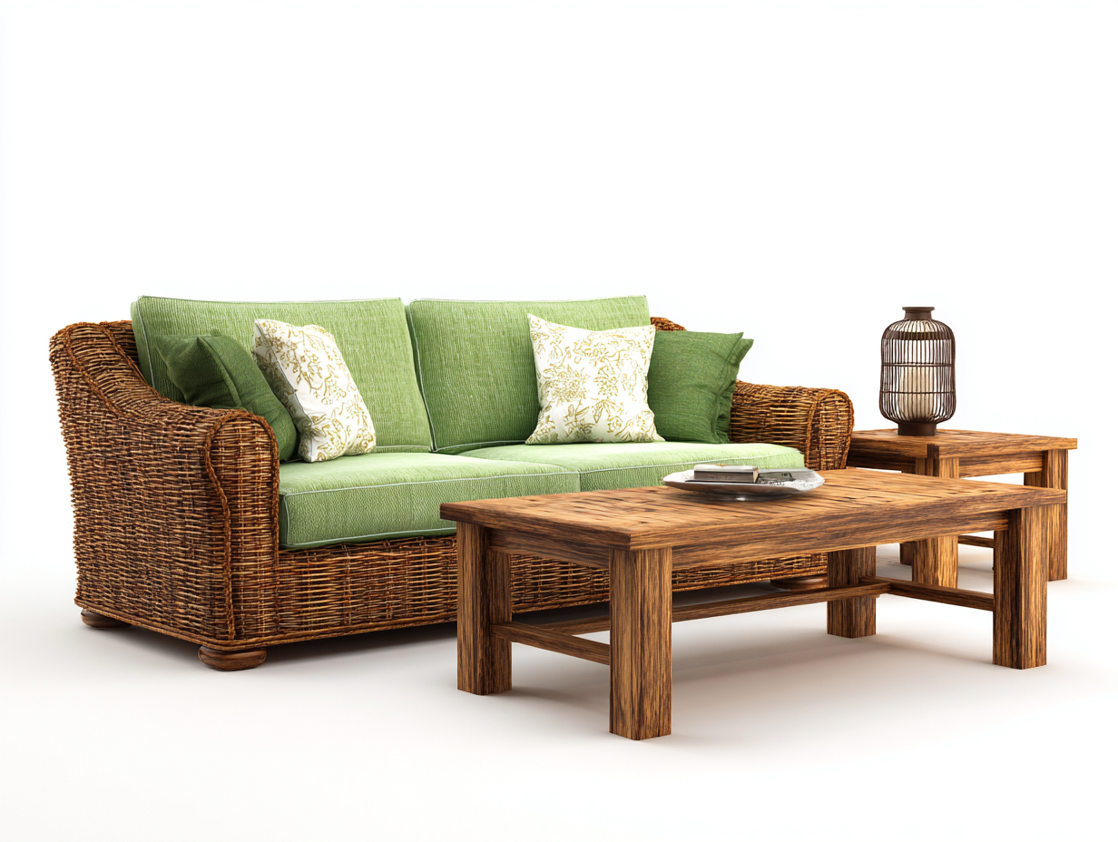 Sofás de exterior de ratán 180x75x80 cm marrón claro cojines verde diseño moderno para jardín